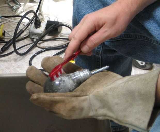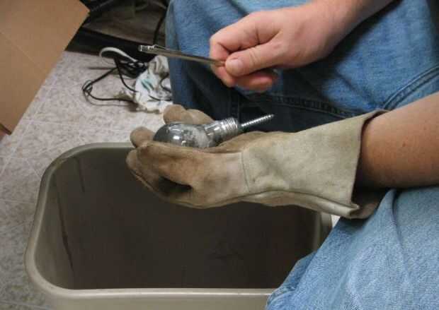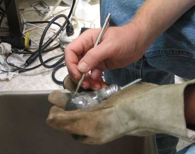 Sobre un bote de basura, mantener la bombilla en una mano que tiene un guante en él. Me has probado a usar guantes en ambas manos en este momento y no tenía el control de estabilidad que quería. Usted podría ser capaz de hacerlo.
