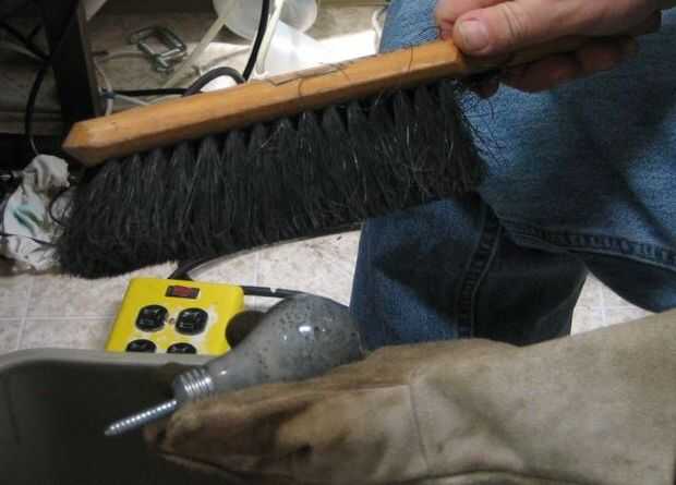 Cuando se ha quitado todo el vidrio de la bombilla, tomar a su escribano y cuidadosamente alrededor del cuello de la bombilla donde el metal reunieron en el vidrio. Asegúrese de que hay no hay fragmentos de vidrio sueltos debajo del borde del metal. Sacuda y golpee el bulbo para ver lo que flota suelto. Cuando termines, toma un cepillo de tienda y ejecutarlo sobre el bulbo entero una vez más para salir de cualquier grano de cristal o piezas sueltas de los agujeros en el hormigón.