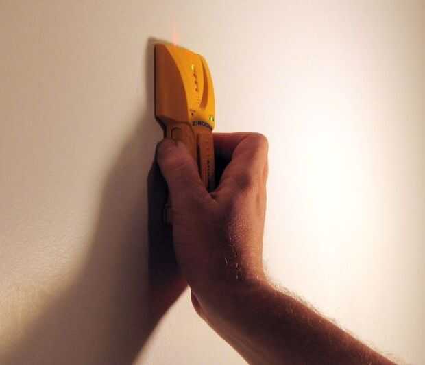 1) encontrar el perno. Esto quiere que una viga de madera en la pared. Hay varias maneras de encontrar un poste de madera, estoy usando un localizador de montantes de muerto de hambre.