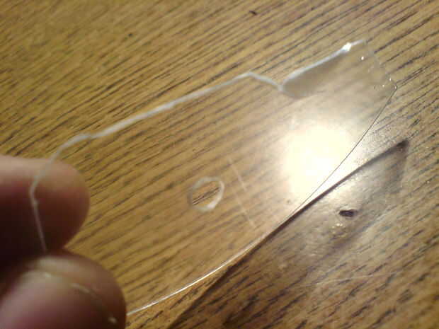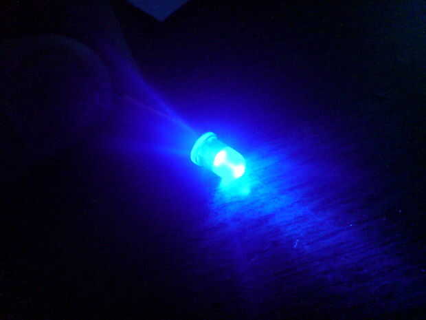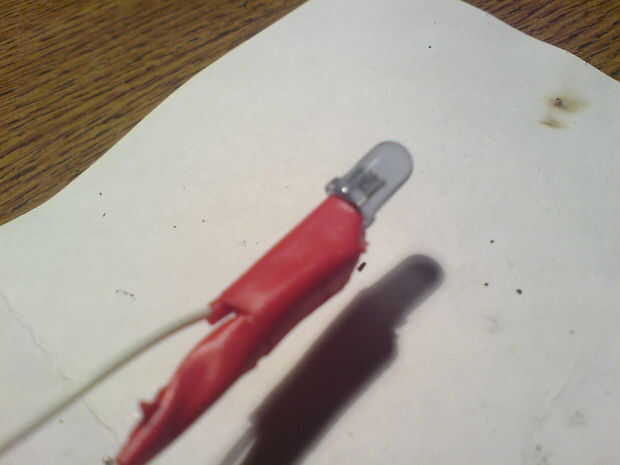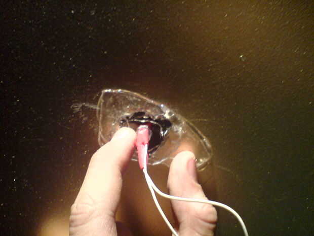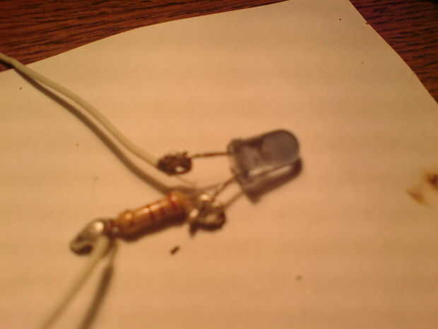 En primer lugar, usted sabe que, supongo, ressistor al negative(shorter) de cable de LED de la soldadura. Después, soldar dos cables más. Luego, tak un plástico y perfore un orificio de 5mm... Pegamento caliente que en lata, en medio del agujero.