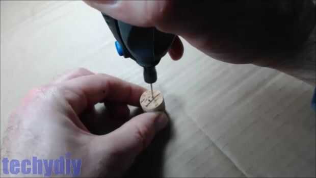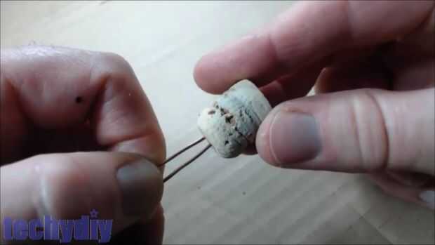 - Haga dos agujeros en el corcho. El diámetro de taladro (1mm) debe ser ligeramente más pequeño que el diámetro de los alambres rígidos en el corazón led.