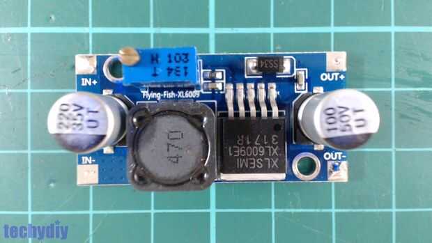 - Ajustar la tensión de salida de 30 voltios girando el tornillo en el potenciómetro azul del módulo.