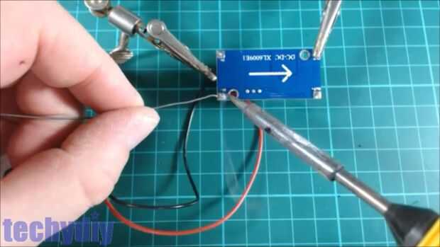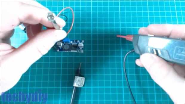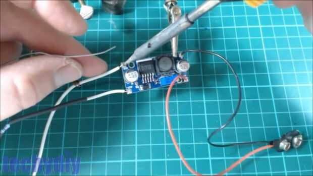 - El 9 voltios conector positivo (rojo) cable de la batería al polo positivo del módulo + en el terminal de la soldadura.
