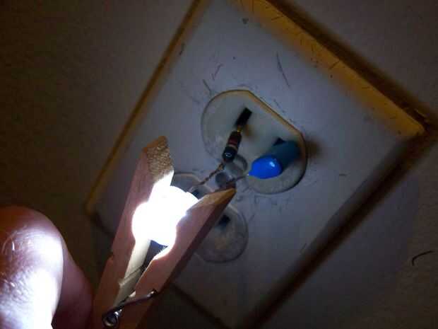 Aquí mantengo el circuito con una pinza para la ropa y pegarse a una toma de corriente, esto es por supuesto, el procedimiento de prueba recomendado. ;-)