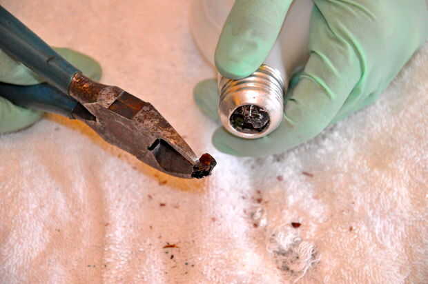Se necesita: aguja nariz pliers, alambre cortadores (o alicates regulares), pinzas, hisopo de algodón sal, esponja, agua y un Destornilladorde cabeza plana . Este paso es uno de los pasos más difíciles, pero no debe renunciar. Con paciencia y orientación sabemos que podrás desmontar correctamente la bombilla.