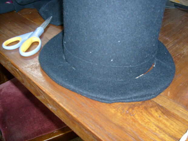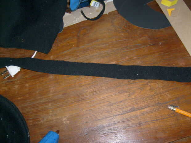 corte una tira de tela de una pulgada de altura y aproximadamente dos pulgadas más largo que la circunferencia del sombrero. pegamento a lo largo de la costura de donde el cuerpo del sombrero con el ala.