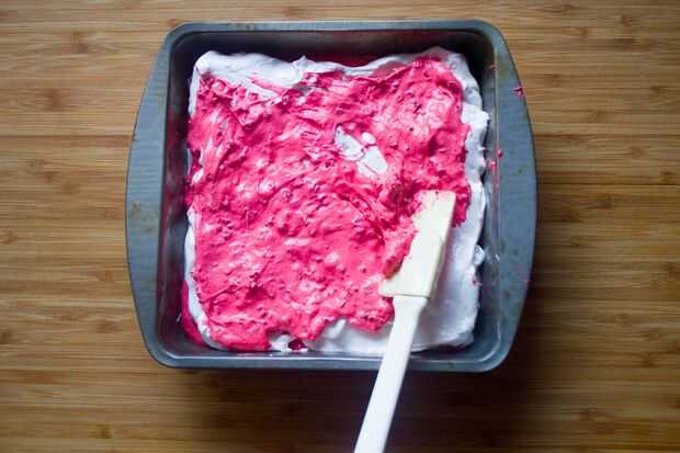 Vierta la mezcla restante de malva roja sobre la capa blanca previamente vertido. Una vez más, se extendió a los bordes de la cacerola, cubriendo tanto la capa blanca por debajo, como sea posible.