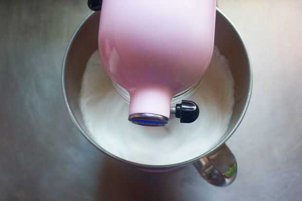 Batir la mezcla de almíbar y la gelatina en medio hasta que se duplique, 8-10 minutos. Aumentar la velocidad a media alta y ritmo por otros 3-5 minutos. Finalmente, aumentará la velocidad de la batidora al máximo y venció por 1-2 minutos.