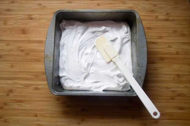 Preparar un molde para hornear de 8 x 8 frotando la parte inferior y los lados con tocino filtrada, o con aerosol de cocina antiadherente. Volcar 1/3 de la malva común base en el molde y extender con una espátula de goma, creando pequeños, irregulares "chuletas" en la superficie de la melcocha; Esto creará una línea ondulada entre las capas rojas y blancas.