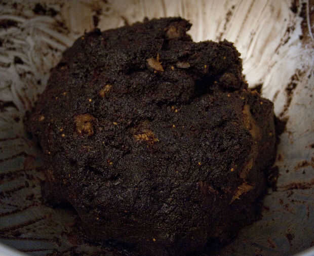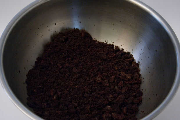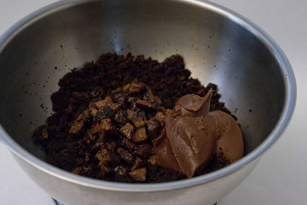 2. usando las manos, se desmoronan por el pastel de chocolate hasta que se en pequeñas migajas.