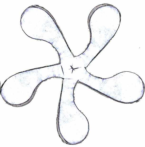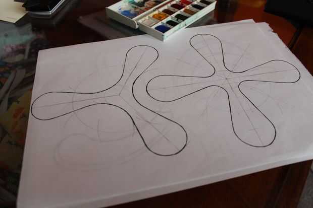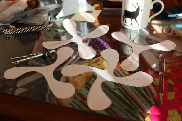 Así que diseñé cada boomerang a tienen la misma longitud desde el centro. tienen el mismo círculo en la parte globular en el extremo (la parte de la globalización fue parte de mi diseño y no es necesario para que la pieza de trabajo) y las partes más finas fueron todos el mismo ancho.