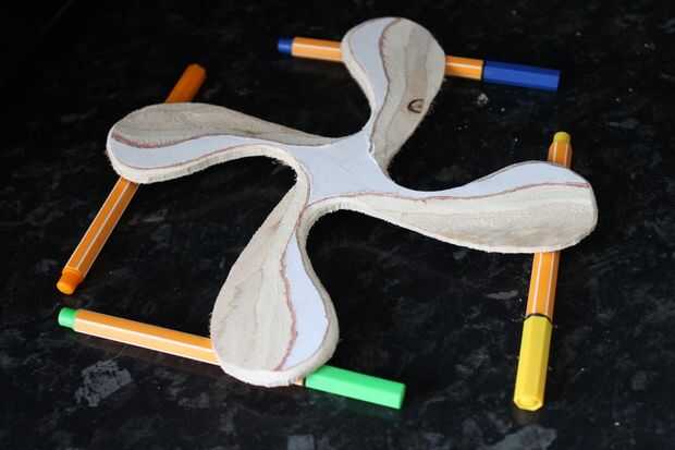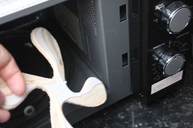 Para dar tus alas diedro positivo ponerlo en el microondas a plena potencia para alrededor de 4 segundos (se ablanda el pegamento de la capa y posiblemente ablandar ligneum en la madera) entonces coloque el bumerán sobre una superficie donde se pueden celebrar sus alas por encima de su centro. el centro de peso y como se enfría la pieza se mantendrá la nueva forma de diedro.