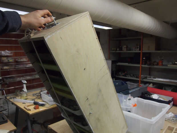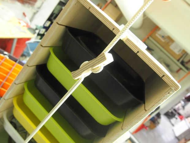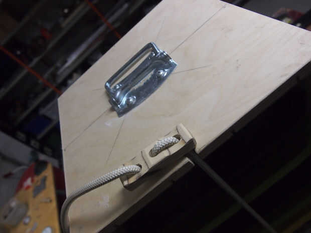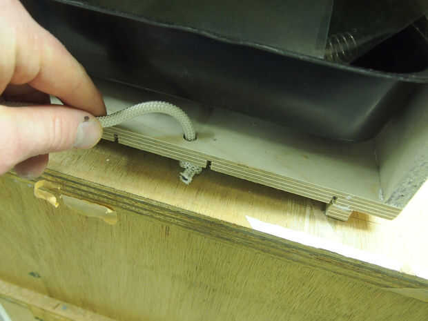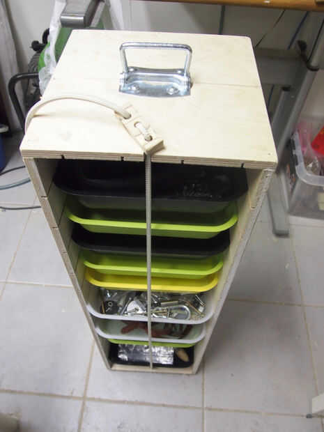 Por lo tanto, no a tener 12 bandejas llenas de cosas buenas caiga al moverse entre proyectos que hice una cuerda elástica en la parte frontal mantiene todo en su lugar. Sujetado en la parte inferior y una liberación rápida en la parte superior con una solución ajustable. La manija en la parte superior está trabajando muy bien para llevar.