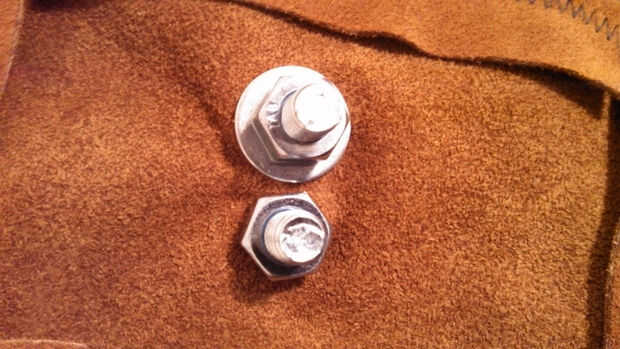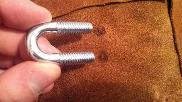 Uno tiene un lugar elegido contorno donde va a ser con un lápiz y cortar hacia fuera. Es mejor para los agujeros ligeramente demasiado pequeño para que encajen firmemente alrededor de los dientes (Innuendo no). Una vez se los hecho dos de los tornillos y tuercas a en metal U doblan. Luego colóquela en los orificios. Añada una arandela en uno de los dientes (yo habría utilizado dos arandelas pero no cupieron derecho.) y luego apriete las otras dos tuercas en la parte superior.