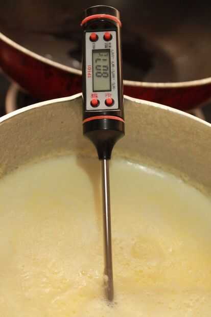 Calentar la leche a 80 grados centígrados y añadir limón jugo 1 cucharada a la vez y revolver para formar la cuajada.