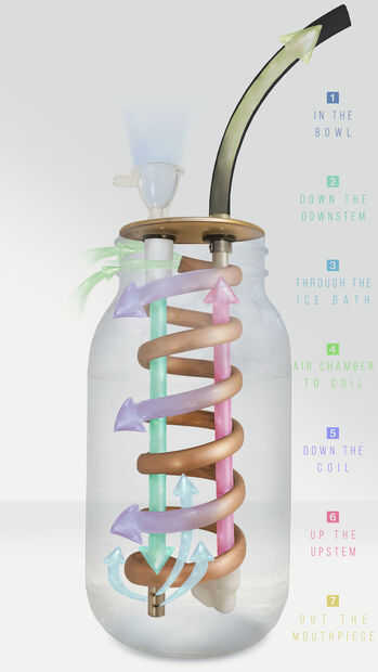Compruebe la imagen principal de un fantástico diagrama. Mi versión funciona exactamente del mismo modo, aunque un poco más... DIYey. Yo uso un pedazo de juego de zócalo en lugar de un recipiente y un tubo de drenaje para la pipa de la cachimba en la imagen. El aire entra en la parte superior a través de la taza, el resultante humo va hacia abajo la blanca y las burbujas hacia fuera a través del agua. El agua la fuerza hacia arriba en el espacio vacío en la parte superior de la jarra, donde su chupar medio tubo y espiral del humo es succionado en la bobina donde pasa a través del agua y se enfría otra vez. Luego, varios accesorios convertir la bobina pequeña 1/8" a un más grande 3/4" upstem y se lo pasa en el tubo que se ha unido a la parte superior. El mayor diámetro de guarnición de tubo permite el humo recoger y cultivar más concentrada, que significa que cada golpe va pegar más. El proceso de percolación y la bobina significan que el humo sea hielo frío y suave como puede ser cuando llega a la boca.