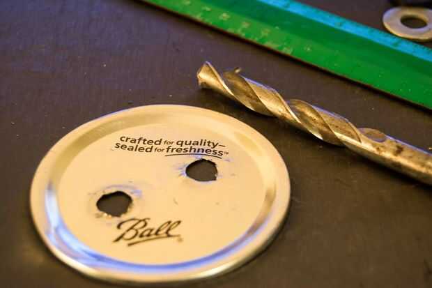 Agarrar la parte superior del tarro de masón. Taladro 3/8 orificios en las posiciones indicadas, entre el centro y el borde. Los agujeros serán lejos de ser perfecto y muy desordenado pero no importa porque utilizamos algunas arandelas de sellado más tarde. La broca dejará algunas rebabas y piezas dobladas alrededor de los bordes. Utilice el dremel o una lima de metal para eliminarlos. Martillo de la tapa plana otra vez si es necesario.