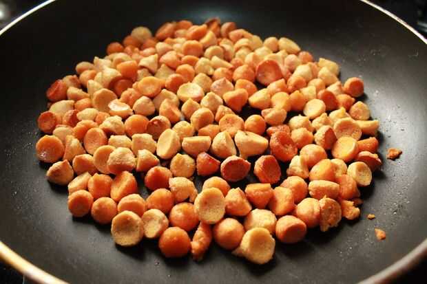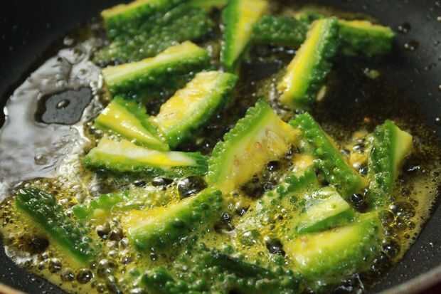 En unas pocas gotas de freír aceite la lenteja gotas (Bori) hasta que gire en color oro y luego freír la calabaza amarga (Karela) una cucharada de aceite hasta su crujiente y ligeramente marrón. Mantener la llama en un medio bajo para evitar quemar cosas. Sacar y mantener a un lado.