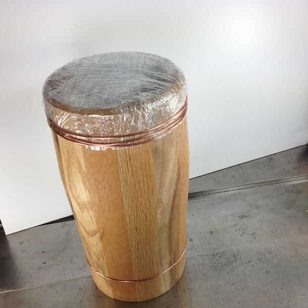 Las maderas utilizadas en este tambor son roble, caoba y acacia. Tuve una reacción alérgica a la acacia y tuve que comprar un respirador para terminar el proyecto!