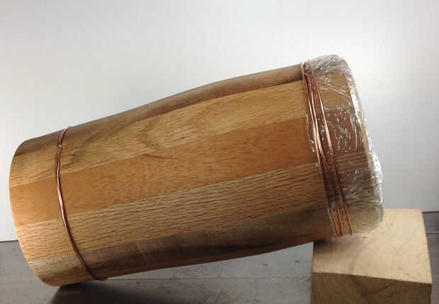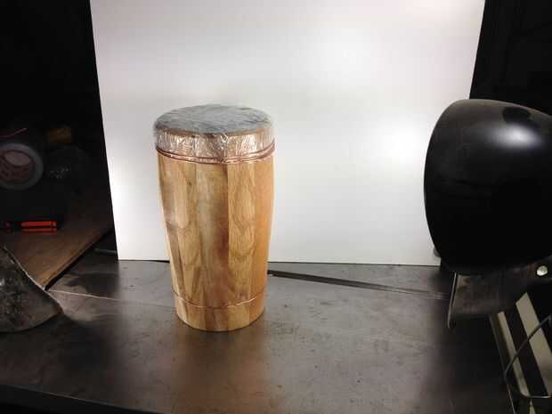 Después de fue sólo una cuestión de embalaje del tambor en estirable y afianzarlo. Jugó con muchas maneras de hacerlo y me colocó sobre el cobre. I algunos agujeros perforados, inserta un extremo del alambre y firmemente envuelto alrededor. Terminé haciendo tres vueltas en la parte superior y uno en la parte inferior.
