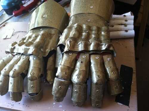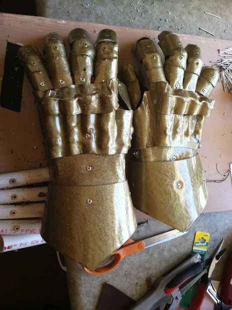 Así que miré algunas fotos de guantes y subió con la idea de utilizar poliestireno termoplástico para ellos. Poliestireno tiene mucha fuerza, especialmente cuando se forma en una forma tridimensional. También es bastante fácil de forma con una pistola de calor. En lugar de los tradicionales remaches, pensé también que remaches funcionaría a solo dandy.