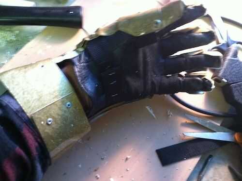 Hay una correa que va en donde la palma con los dedos. Las instrucciones de usan una correa pequeña. He utilizado la web Negro correa y velcro. Me caliente pegado el velcro en la cinta y poner en grapas con una engrapadora de trabajo pesado.