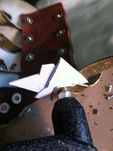 Tres tiras de cuero sostienen la parte posterior de la placa de la mano a las piezas de la muñeca.