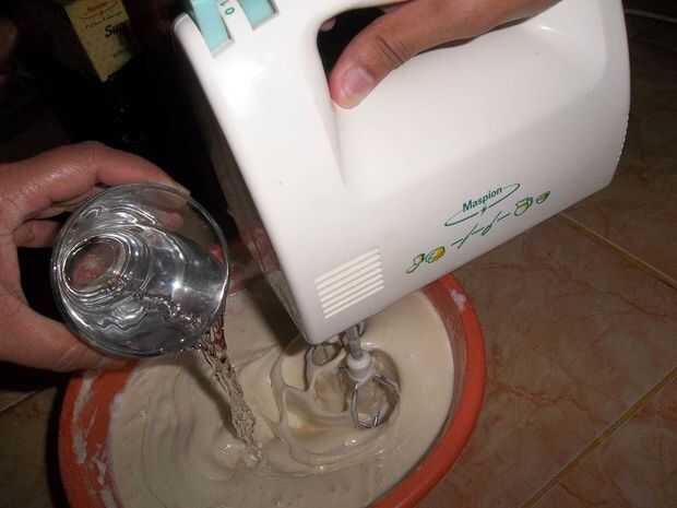 Después el aceite vegetal, agregue el agua a la mezcla, poco a poco.