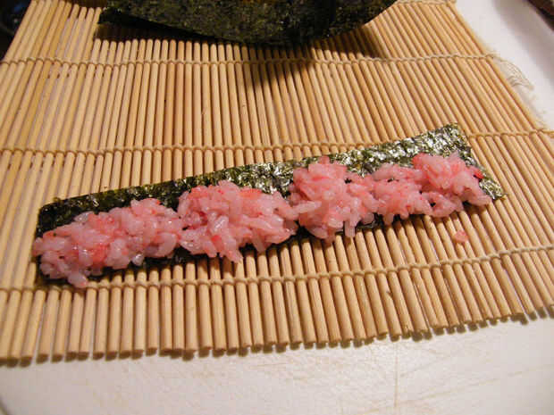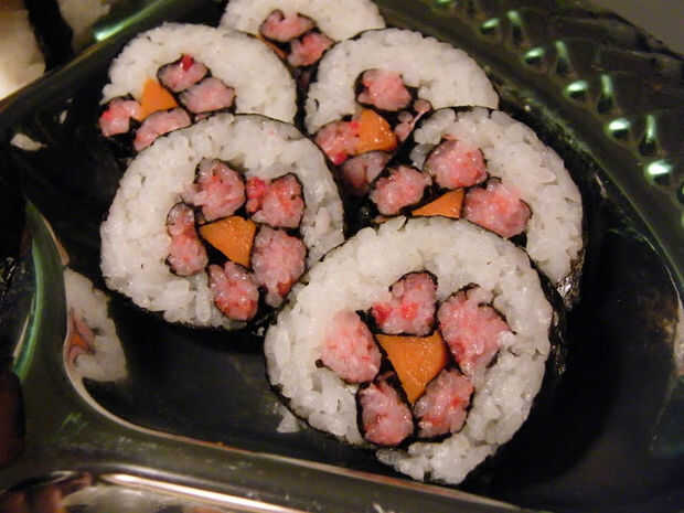 Ajustar estos "relleno" que le pila muy bien así que cuando usted corte el sushi, se mostrará una flor
