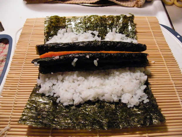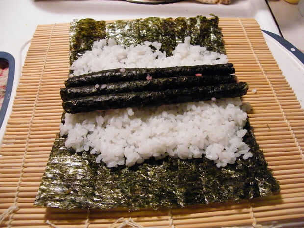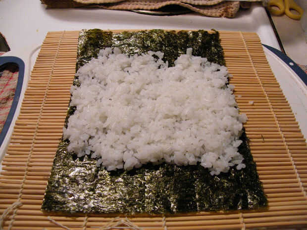 Tomar la una hoja de nori completo y arroz sushi regular como se muestra en la imagen