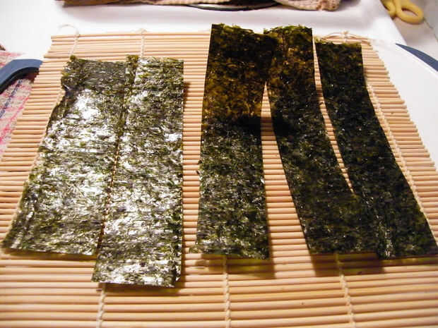1 hoja de nori completo, cortar 5 hojas de tamaño mismo como se muestra en la imagen