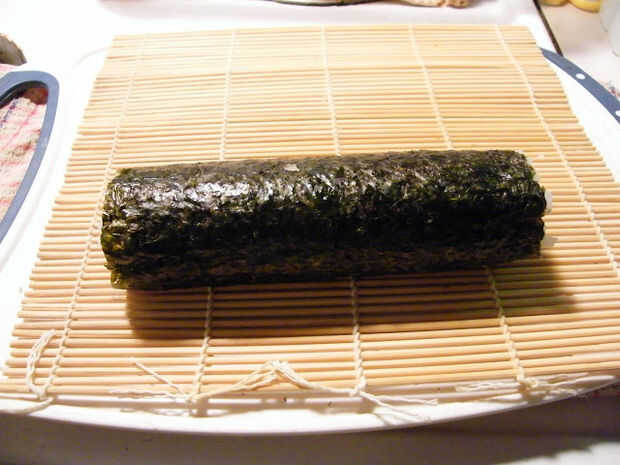 Rollo de sushi, apretada con el rodillo de bambú y rebanada