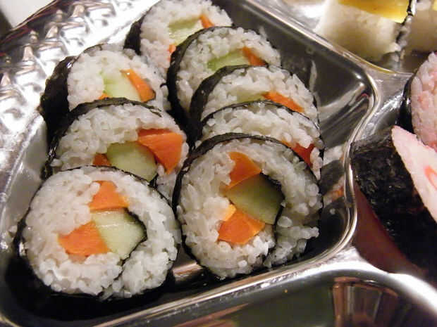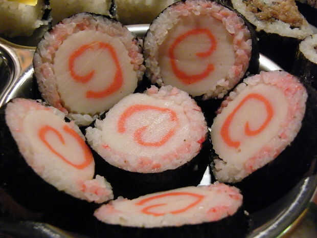 Colocar una hoja de nori, arroz de sushi, que se separa bien, y tiene el relleno en el centro, como listo para usar pastel de pescado (kamaboko - pueden adquirirse en tiendas asiáticas o supermercados), etc. aguacate, hortalizas,