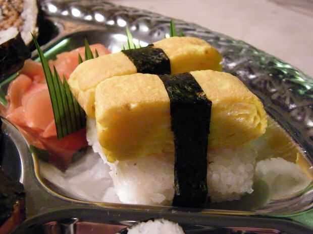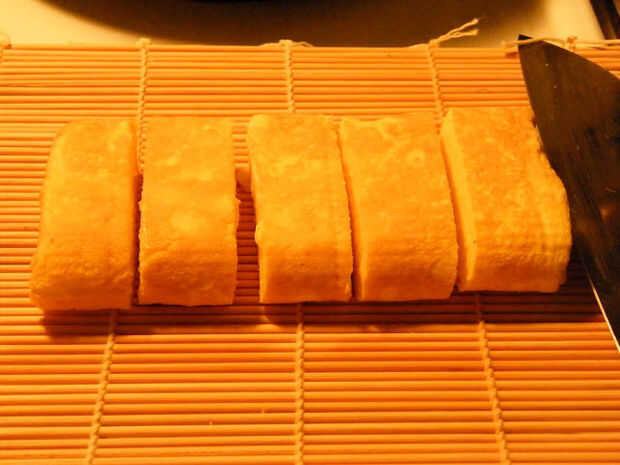 Esta tortilla en rodajas luego es había atado a un pequeño sushi con forma rectangular y asegurado con "cinta" de corte hoja de nori.
