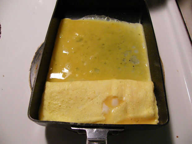 Una vez que la tortilla empezando a parecer reafirmante en el fondo, rodar de un extremo al otro extremo y vierta más mezcla de huevo, se muestra en la fotografía. Una vez que esta capa es reafirmante, así, a la primera capa del rodillo y vierta más mezcla de huevo (para hacer 3 capas de tortillas)