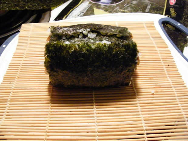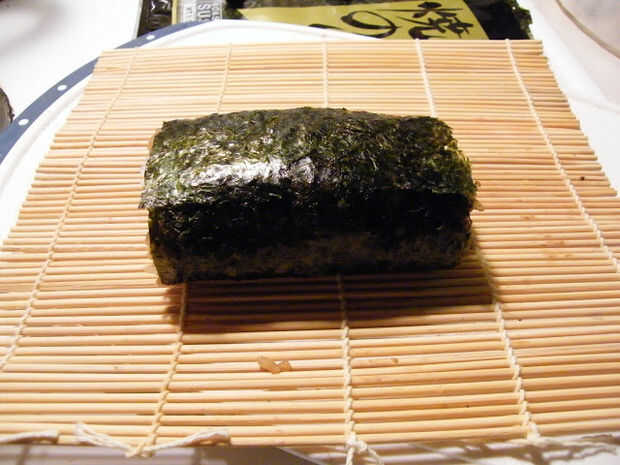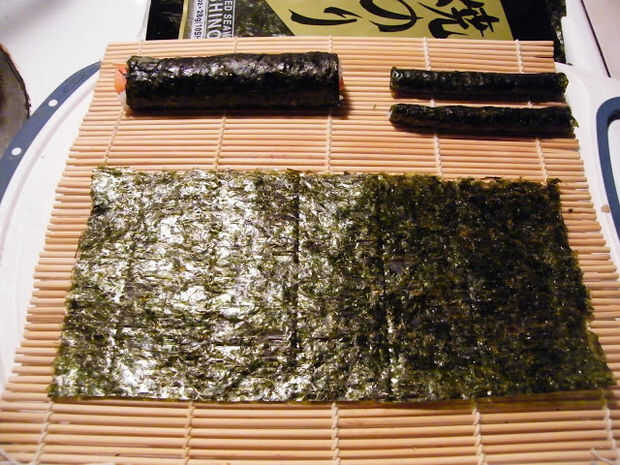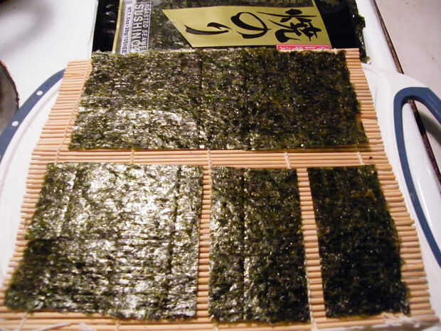 Tomar otra nori y poner la cabeza susi en este nori para ver cuánto se reduciría el nori (el sushi cabeza no será tan largo como un nori completo, es por eso que tienes que poner en el nori completo para ver antes de cortar)