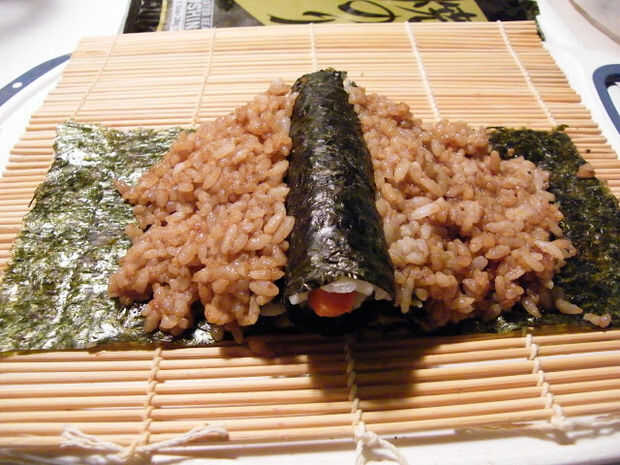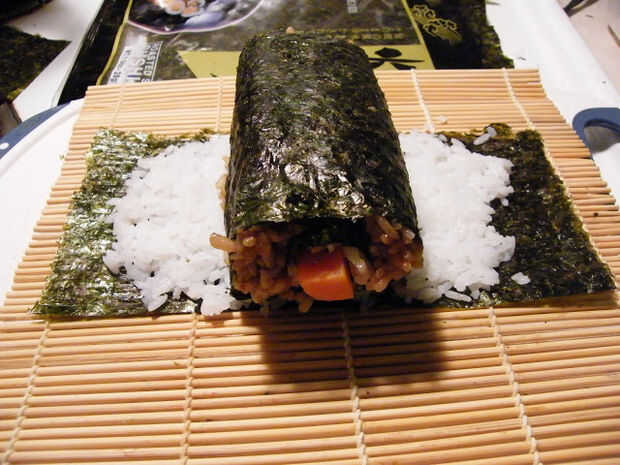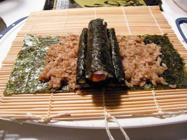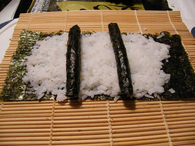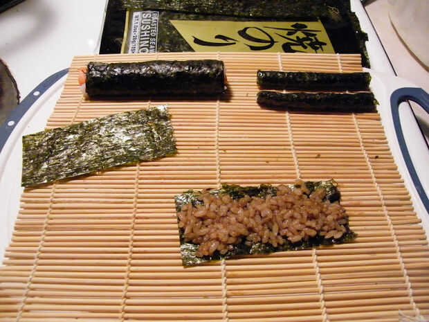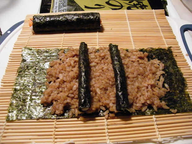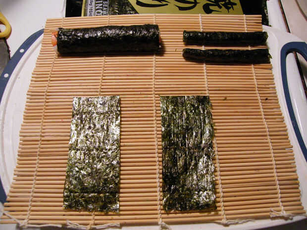 De los otros 2 nori pequeñas hojas, arroz de sushi de difusión que ya está sazonado con salsa de soja, rodar en registros