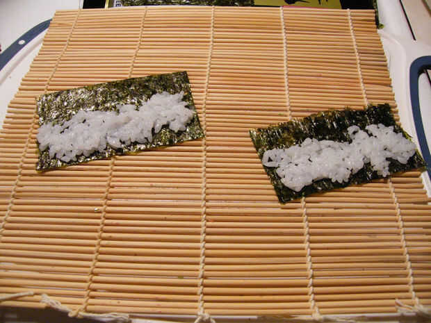 De 2 hojas de nori pequeño, Esparza uniformemente arroz de sushi y rollo en 2 registros.