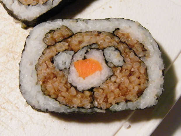 De izquierda a derecha encima de la hoja de nori, sperad arroz de sushi que es sazonado con salsa de soja, colocar 2 registros de arroz (blanco) de sushi regular como se muestra a continuación superior con rollo de sushi de zanahoria, así que apila. Asegúrese de que este amontonamiento se forman ojos y nariz una vez cortado.