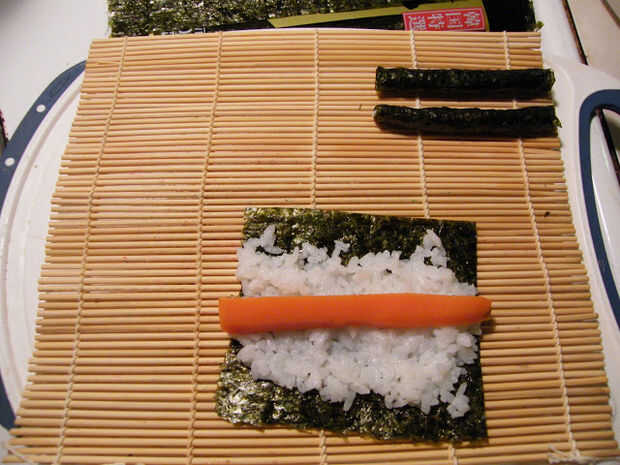 De 1 hoja de nori, extender el arroz de sushi y coloque una zanahoria al vapor en el centro y rodillo.