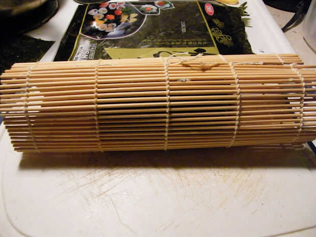 Tapa todo con arroz salsa de soja y rollo, con estera de bambú.