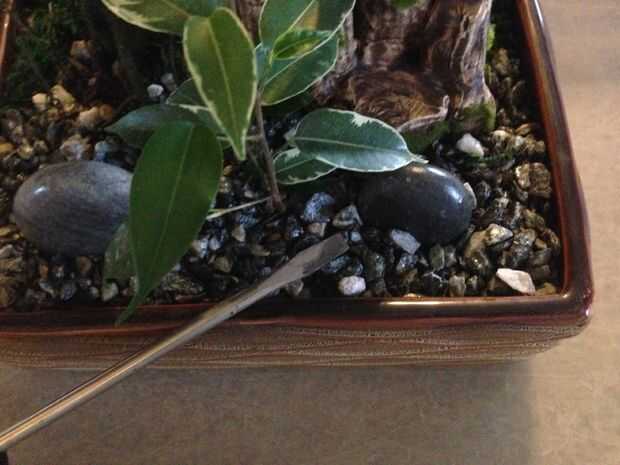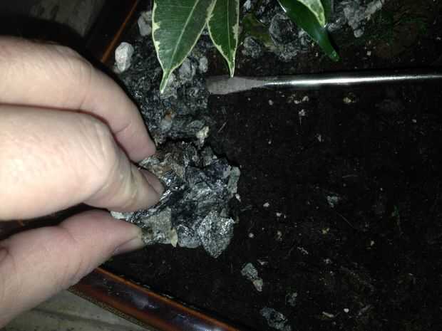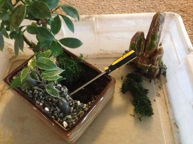 3. con el destornillador, trabajo desde los bordes de la olla hacia adentro para levantar secciones de rocas pegadas, teniendo cuidado de no dañar el árbol o las raíces. Más a menudo encontrará que viene para arriba en grandes secciones.