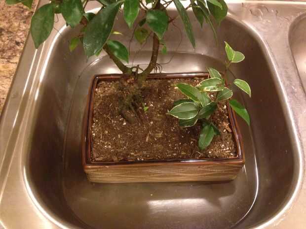 2. Llene un fregadero o tina para un nivel llegar a poco más de media la altura de la maceta y colocar la olla en el fregadero. Es importante que la temperatura del agua es tibia, sobre "caliente t-shirt". Demasiado fría o caliente le choque la planta. Lo deje reposar por 20-40 minutos, pero no más de una hora. Esto es cómo usted debería siempre agua tus bonsais, no de arriba abajo. A menos que el árbol en maceta es demasiado grande y pesado, esta es la mejor forma de asegurar agua alcanza sólo las raíces, límites de interrupción del riego descendente del suelo y ayuda a limita el crecimiento microbiano y molde.