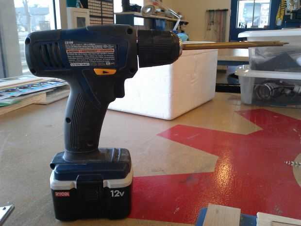 c). herramienta eléctrica: 1/4" taladro con broca plana madera, taladro de madera entre garras de oso.