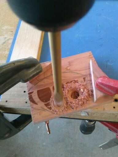 f). ahora voltea la pieza y de la abrazadera hacia abajo. Ir con mucho cuidado, levantarse y mirar hacia abajo en el agujero mientras se trabaja. Use el aire comprimido para limpiar el orificio como perforar hacia abajo.