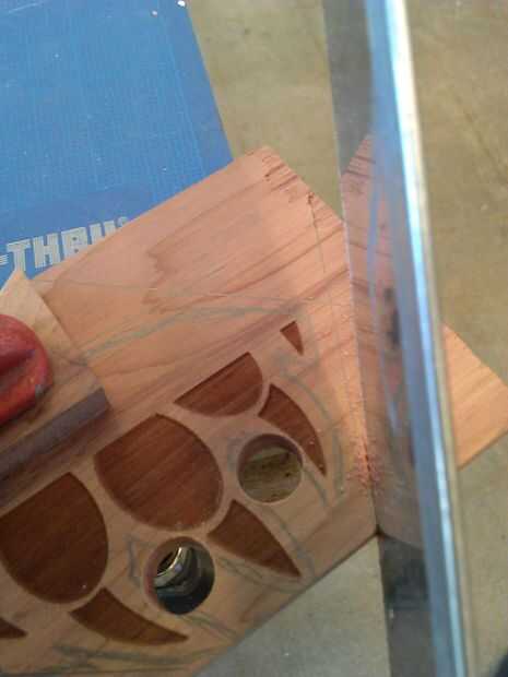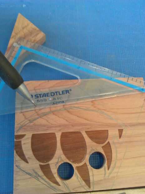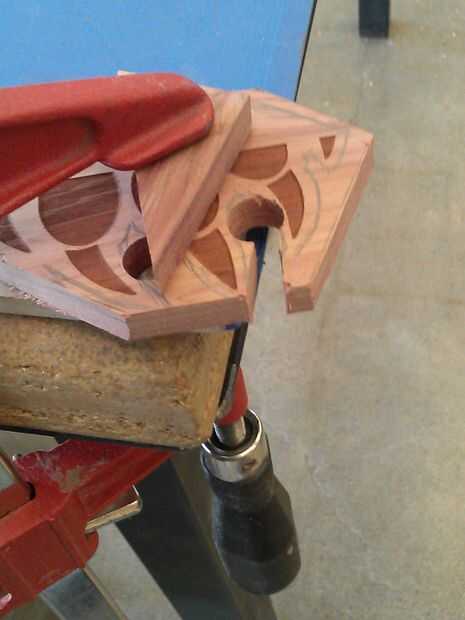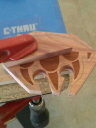 d). luego cortar la madera interior, con las dos manos trabajando su camino a los agujeros que primero taladró. Ten cuidado aquí, no rompe la pieza de garra pequeña apagado que trabajaste tan duro para crear. Aquí es donde el Zen viene pulg. ;) El ritmo y vaya suave.
