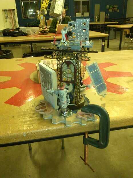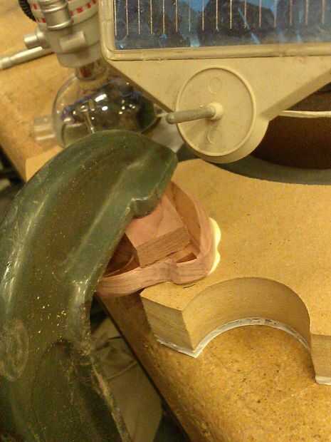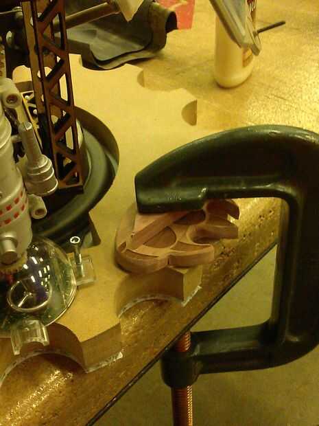 c). Coloque hacia abajo sobre el pegamento y la abrazadera en su lugar. Recuerde utilizar restos de madera para que no marque su arte bastante acabado.