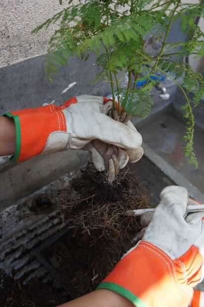 Tomar su vieja olla de bonsai, con palo de retirar todo el suelo de las raíces.