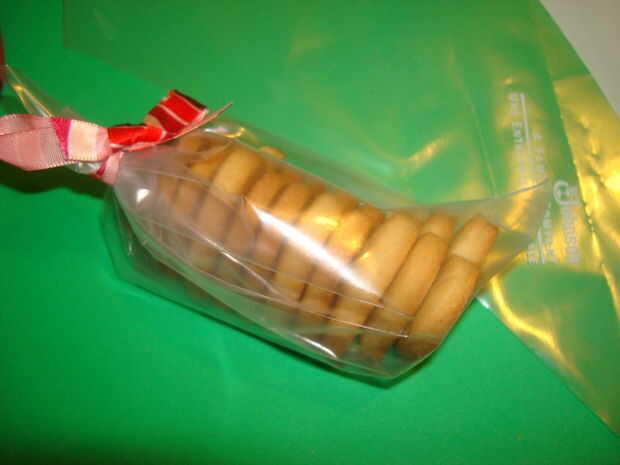 Las galletas en una bolsa de plástico y una cinta alrededor de la parte superior.