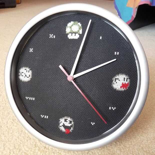 Para mi reloj usé Boo de sprites de Super Mario World. Originalmente quería tener Boos en la mayoría de los números como un circundar Boo Buddy, un enemigo que encuentres en ese juego, pero para ahorrar tiempo solo hice uno de cada tipo de sprite de Boo y un 1-up sprite en la posición doce. Para los demás números hice pequeñas, simples números romanos. Puede organizar sus sprites y combinar diferentes sprites tamaño o números en cualquier forma que desee! Usted puede también bordar en cualquier lugar en la esfera del reloj, si quieres algo en o alrededor del centro.